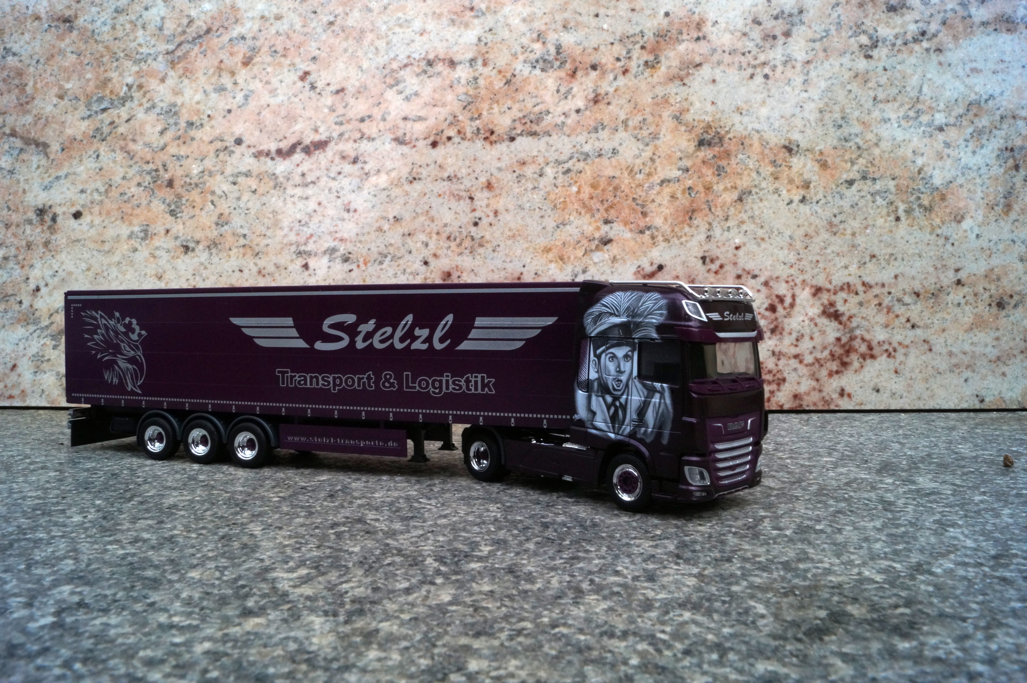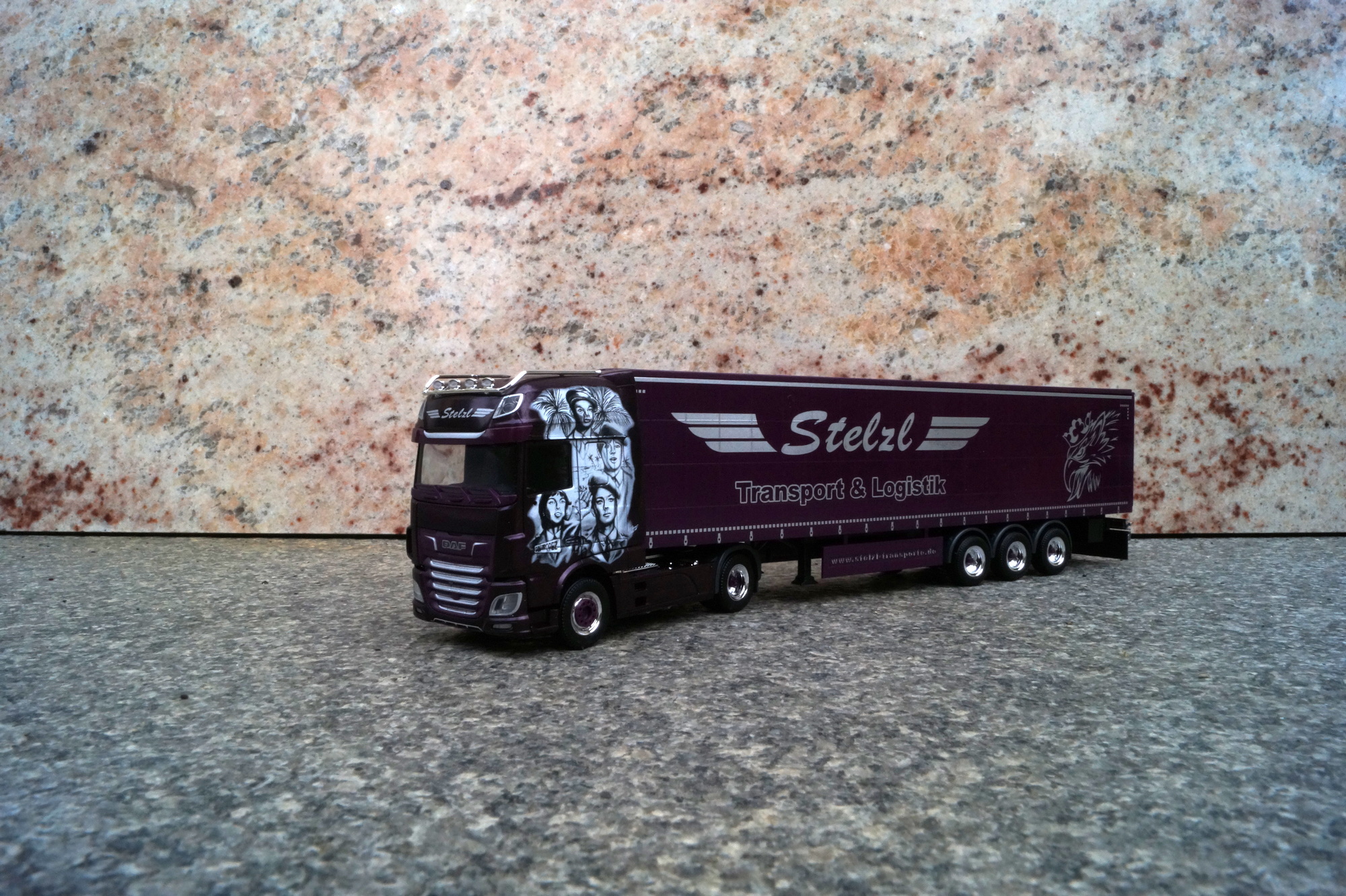 Modell scale 1:87 made by HerpaWalter Rosner hat für die Spedition Stelzl aus dem fränkischem Heideck diesen DAF Gardinenplanen-Sattelzug mit schönen Airbrush-Motiven versehen.
