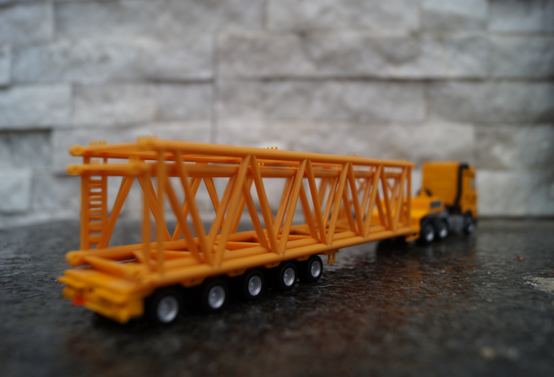 in Deutschland zählt Franz Bracht mit 13 Niederlassungen im Bereich Autokrane, Industriemontagen und Schwertransporte zu den Großen. Herpa setzt zunächst einen Mercedes-Benz Arocs 6×4 mit Tiefladeauflieger um, der mit zwei Gittermastteilen beladen ist.
