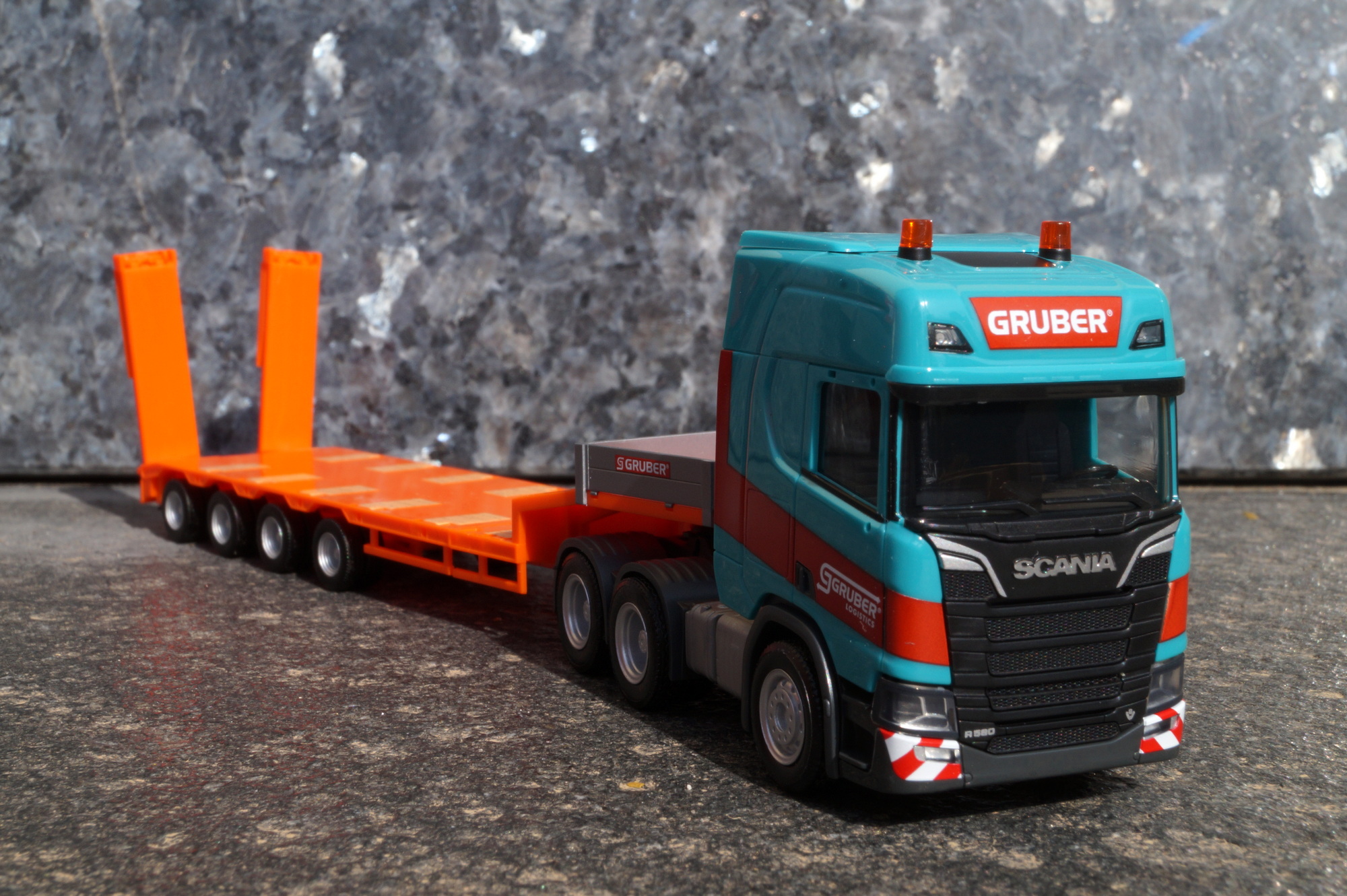 314220 -Herpa - Scania CR 20 HD 6x4 Semitieflade-Sattelzug „Gruber“ (Italien/Auer)