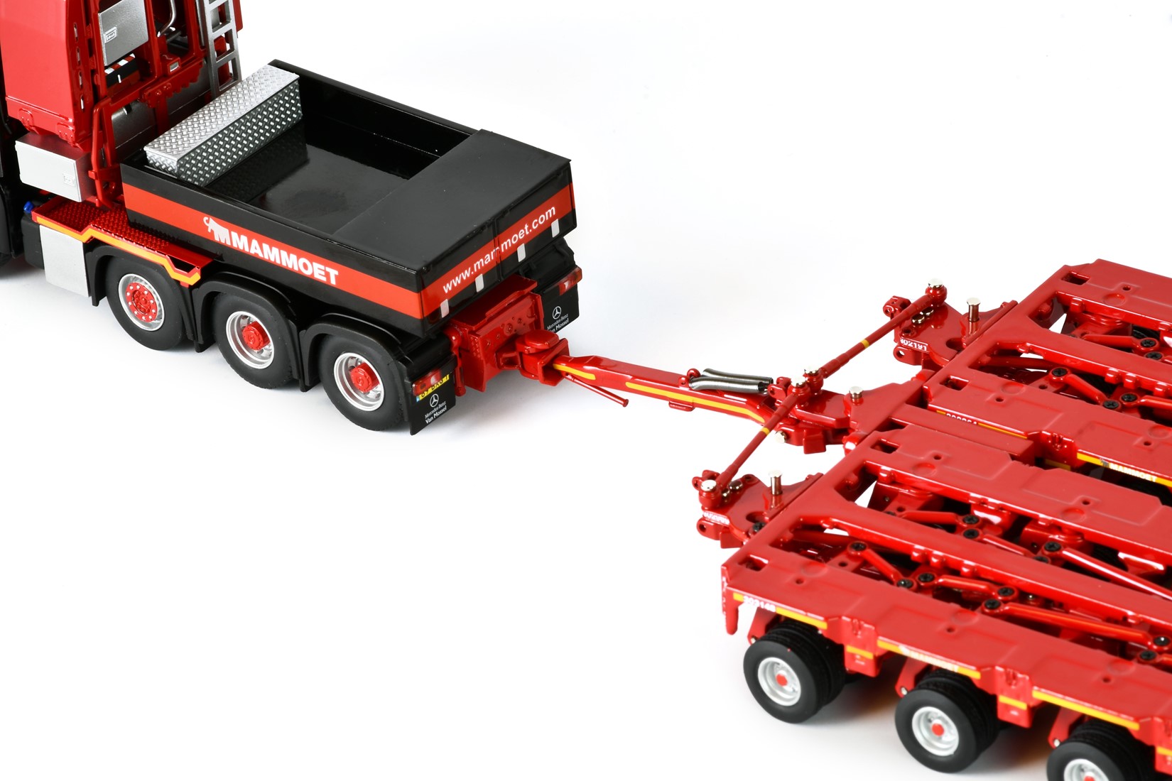 Dieses äußerst detailgetreue Sammlerstück, das in limitierter Auflage von IMC Models hergestellt wurde, zeigt die vollständige Konfiguration, wie sie Mammoet für schwere und lange Lasten verwendet.