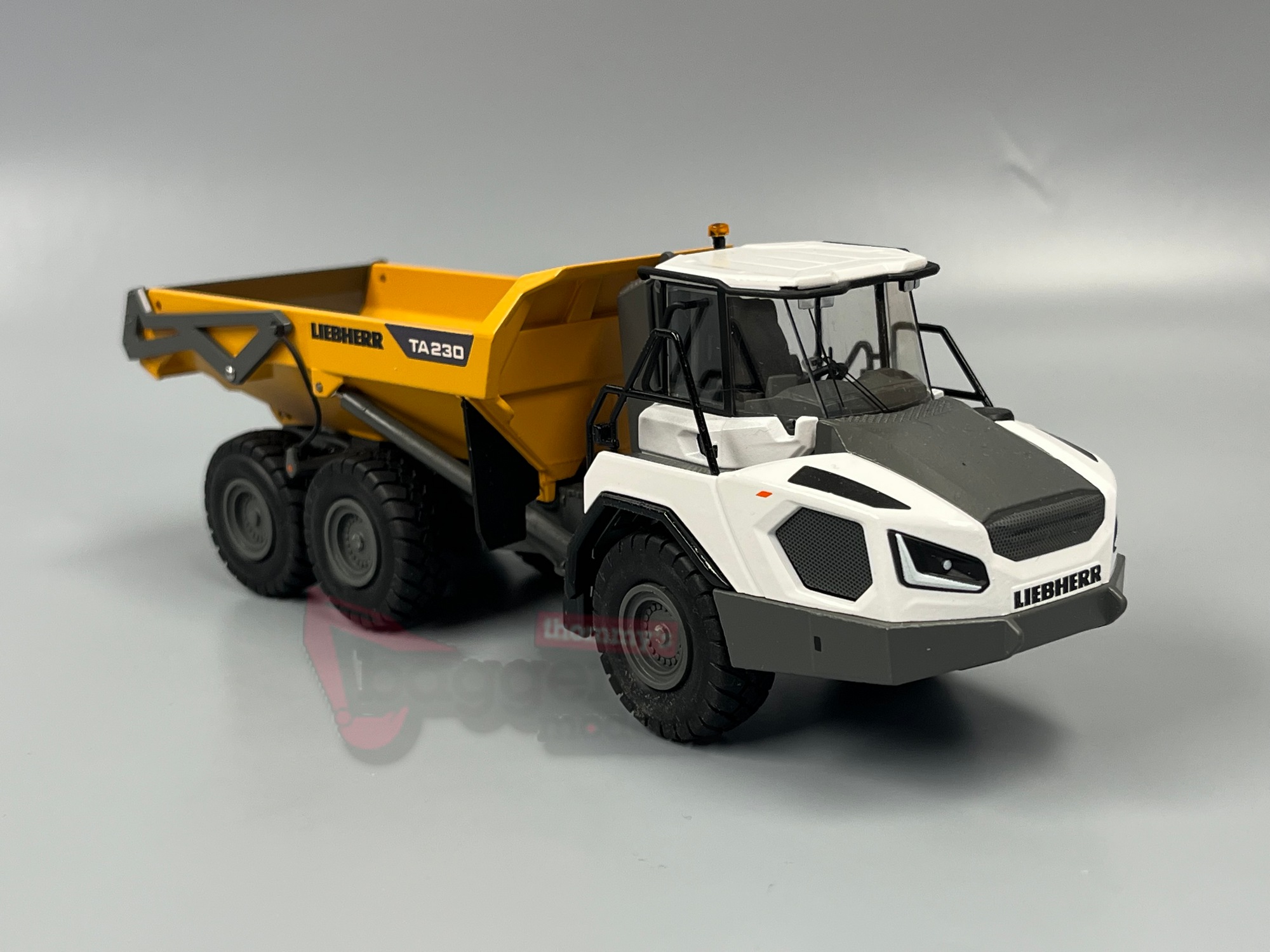 Originalgetreues Funktionsmodell der neuen Generation 8 des knickgelenkten Muldenkippers im Maßstab 1:50. Modell aus Zinkdruckguss von Conrad. Länge: ca. 21 cm