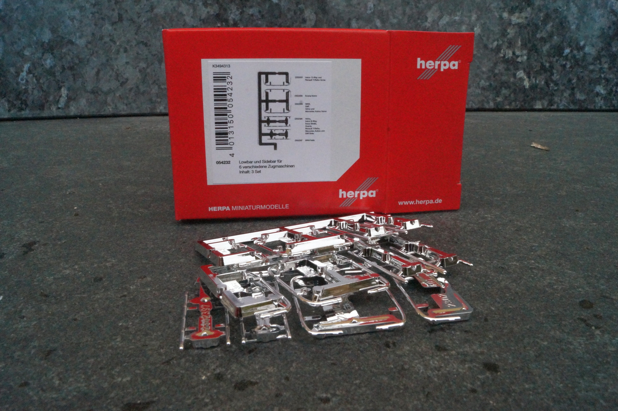 made by Herpa scale 1:87 Formneuheit! Anbauteile für Zugmaschinen erfreuen sich auch bei Herpa-Sammlern und Bastlern großer Beliebtheit um die Fahrzeuge vorbildgerecht darstellen zu können. Auch für Laien im Bereich Modellbau lassen sich diese neuen Zurüstteile mit etwas Klebstoff an den Stoßstangen bzw. Chassisverkleidungen von Zugmaschinen montieren. Eine werkseitige Montage dieser Zubehörteile ist aber leider auch zukünftig nicht möglich. Inhalt pro Set sind Sidebars für insgesamt sechs Zugmaschinen und Lowbars für insgesamt neun Zugmaschinen.