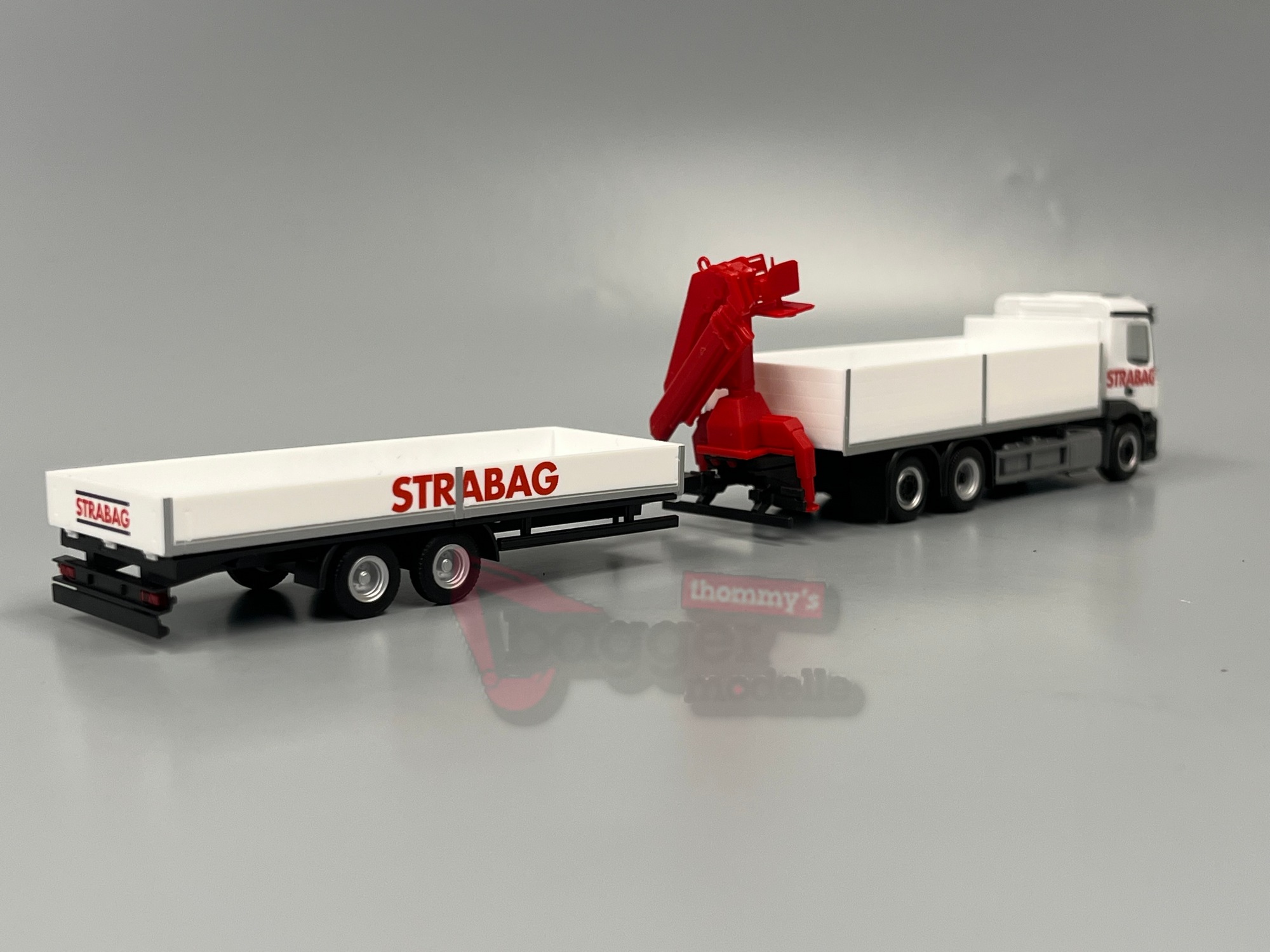 320665 - Herpa -Mercedes-Benz Actros M Baustoff-LKW mit Kran und Tieflade-Anhänger "STRABAG" (Österreich