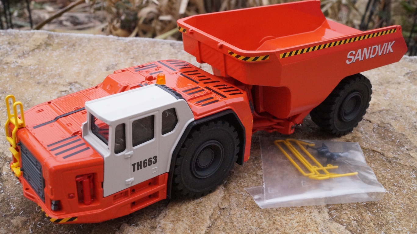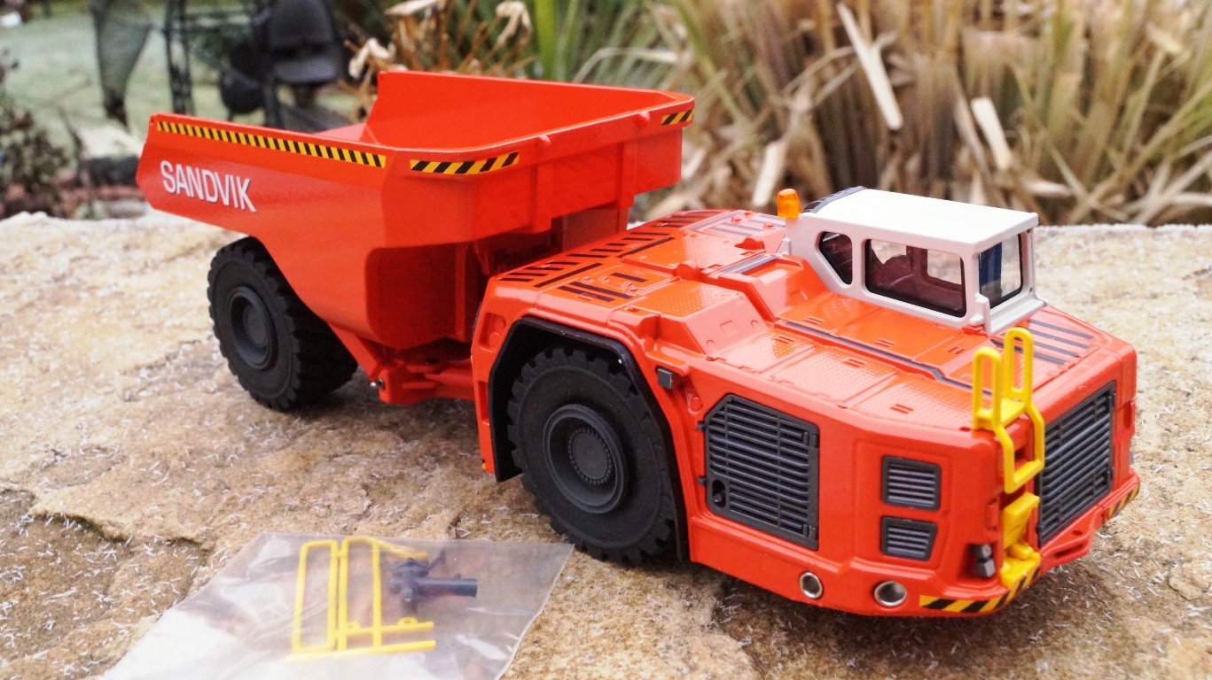 made by Conrad scale 1:50 Vorderwagen 2-fach bereift und schwenkbar mit Hinterwagen verbunden, Muldenrahmen mit pendelbarer Hinterachse, Mulde stufenlos höhenverstellbar, Motorlüftungsgitter zum Öffnen